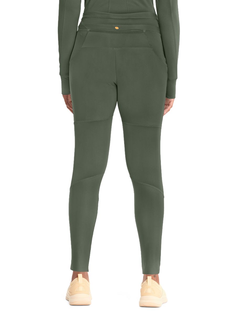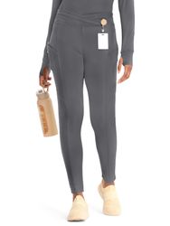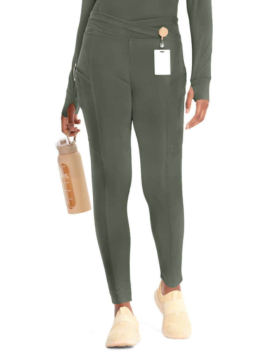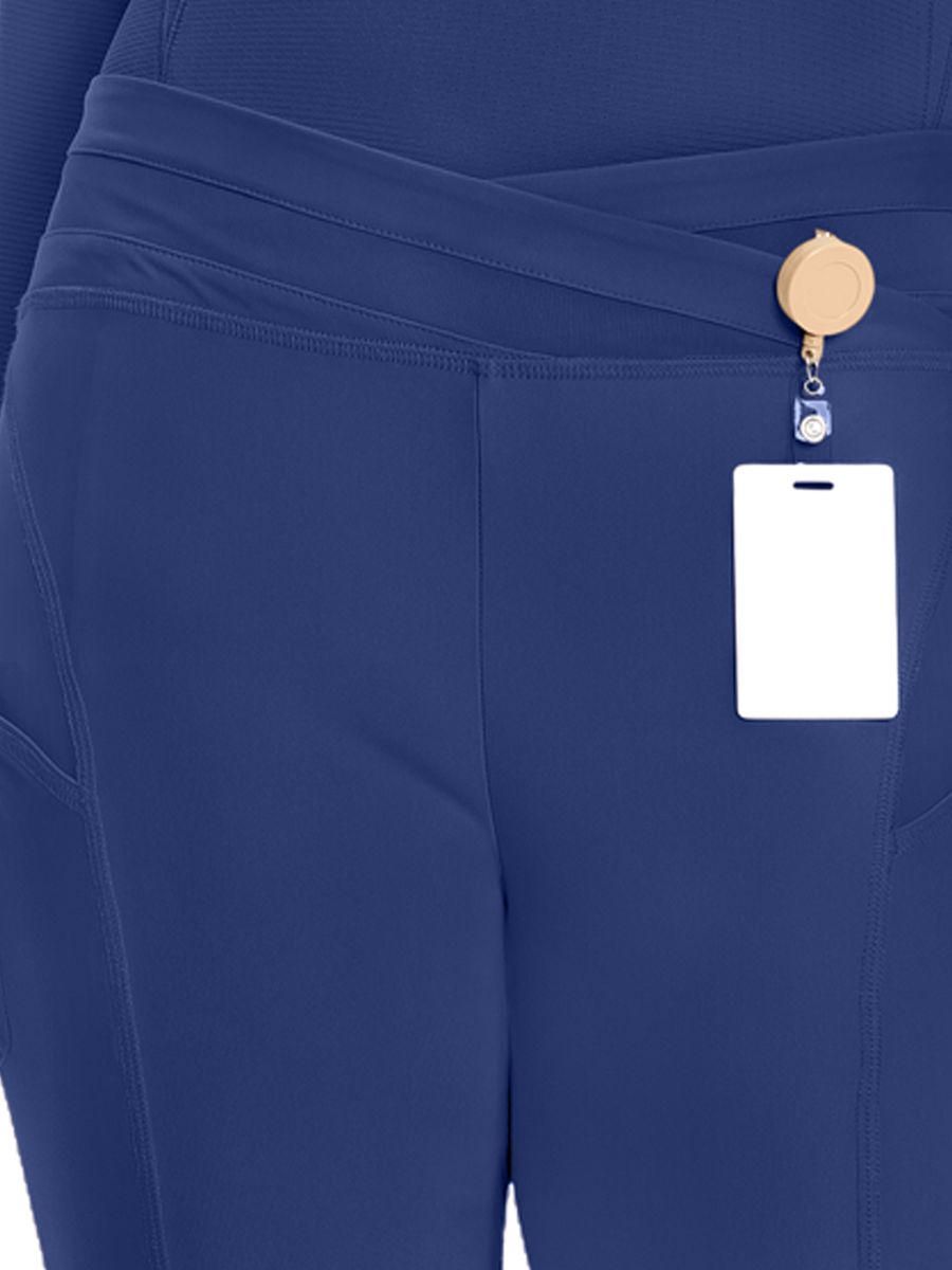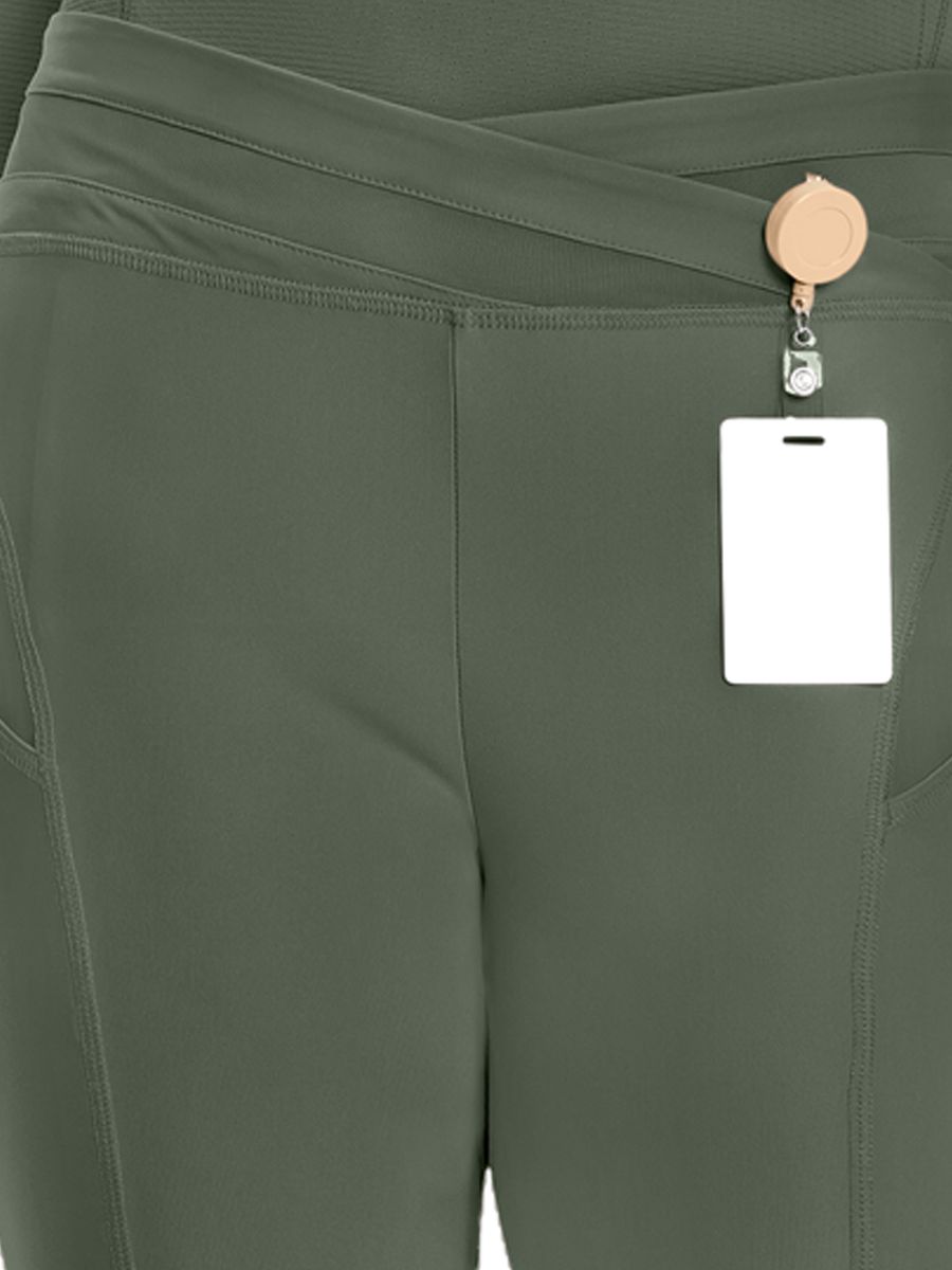 This high rise knit legging is made of a stretchy nylon and spandex blend that is comfortable, durable, and won't stretch out. Inspired by workout pants, the crossover waistband design is reinforced with inside elastic so the legging stays in place. There are four pockets for organized storage: two hip pockets (right with pen pocket) and one mesh pocket below the center back waistband. Tonal mesh overlay on waistband and shaped leg panels. Front leg seams with coverstitching for an athletic look. Bonded hems for a clean finish. Contemporary Slim fit. Fitted leg, 9 ½" opening. Inseam: 28 ½". Featuring PROTX2 technology with antimicrobial and moisture wicking properties.