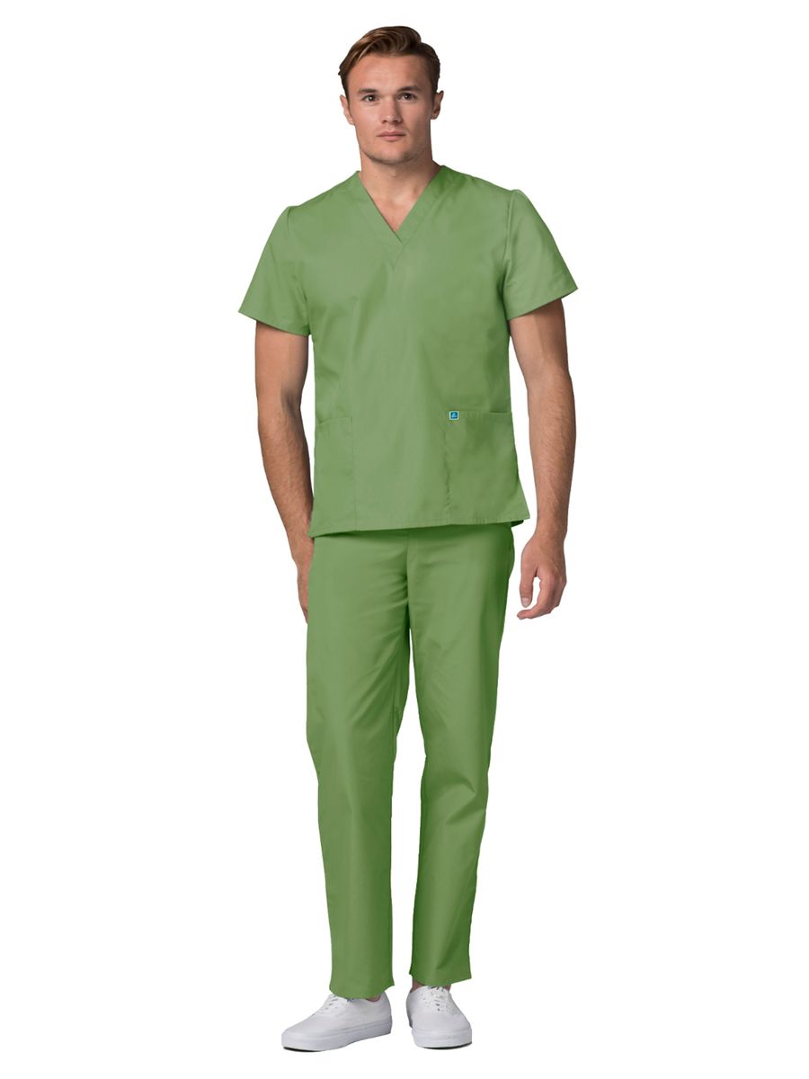 More of everything you want in a scrub set. Classic v-top, unisex fit, is cut for comfort with two roomy patch pockets and side vents. Drawstring pants with unisex fit are neither baggy nor tight, and the string is substantial enough to hold its tie without slipping loose or knotting up. Set wears comfortably tucked in or left loose. Center back length: 28.5". Regular inseam: 31".