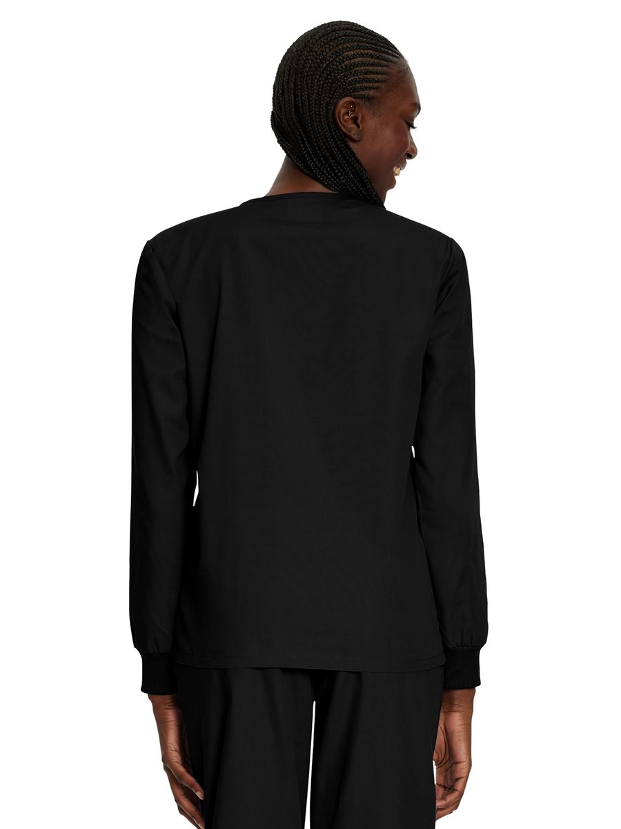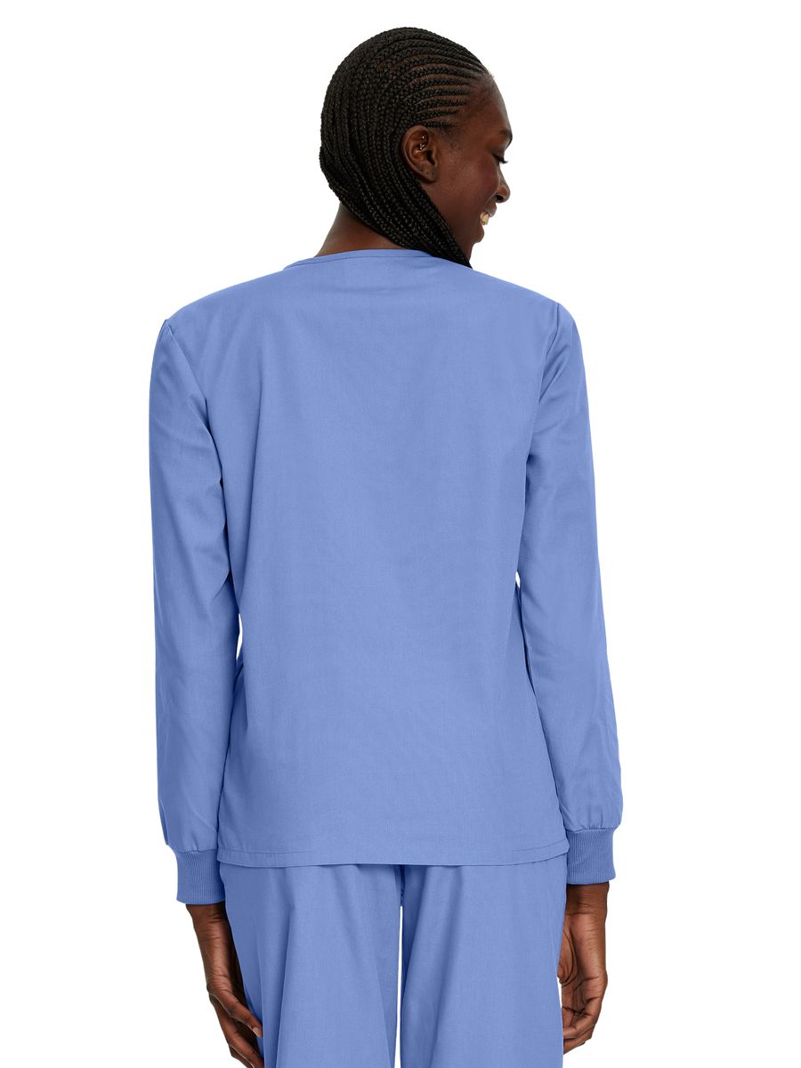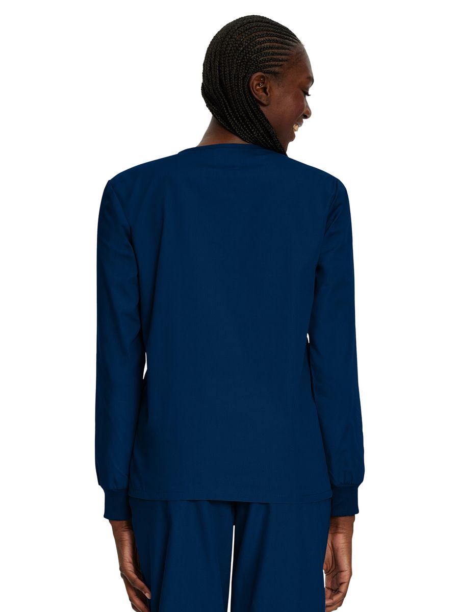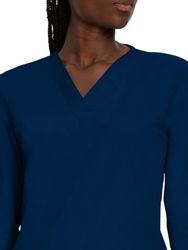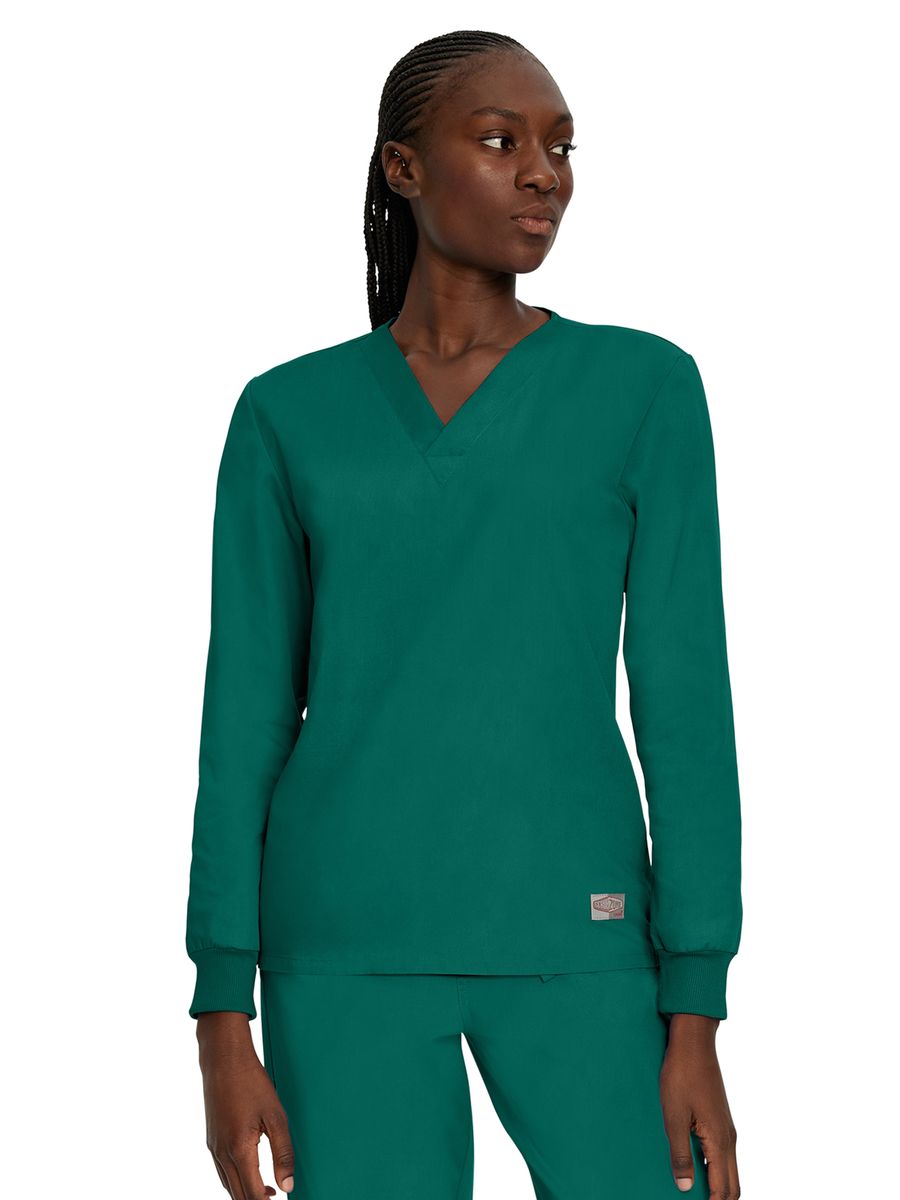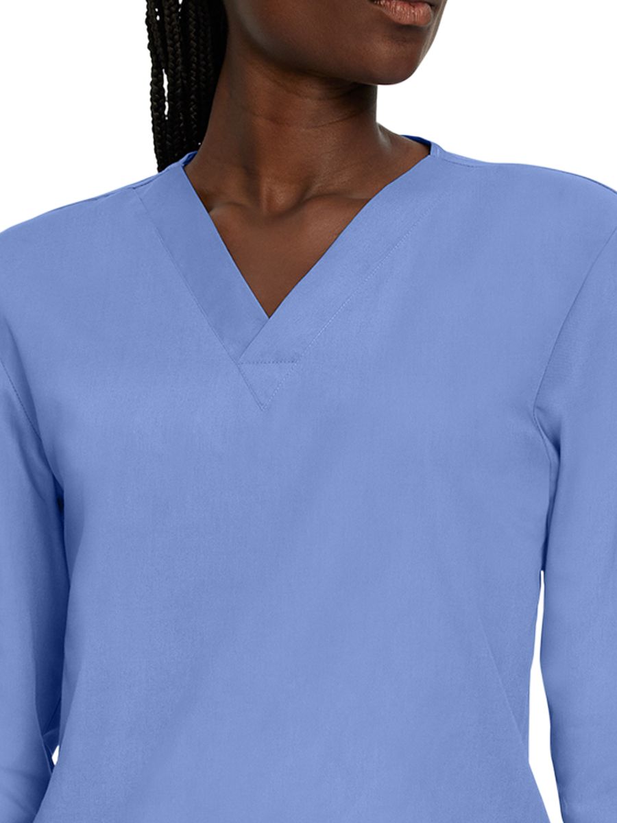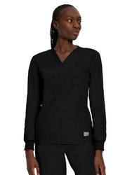 Stay comfortable and protected throughout your workday with this classic fit, long-sleeved scrub top. The flattering crossover V-neck adds a touch of style, while the rib-knit cuffs provide extra warmth and fluid protection. Made from a breathable, fade-resistant fabric, this generously cut top offers optimal comfort and ease of movement, with a clean front and back for a roomier fit. Its durable construction ensures it can withstand frequent commercial laundering, making it a practical and reliable choice for healthcare professionals. Please note: Women may want to consider ordering one size smaller due to the unisex fit.