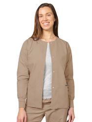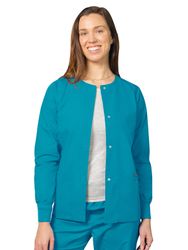Spiff up a simple pair of scrubs or get an extra layer against the air conditioning. Our round neck warm-up jacket is roomy enough to fit comfortably over scrubs yet looks sleek and put together worn over a t-shirt. Stitched neckline, four snap-front closures, and knit cuffs. Center back length: 28.5".
