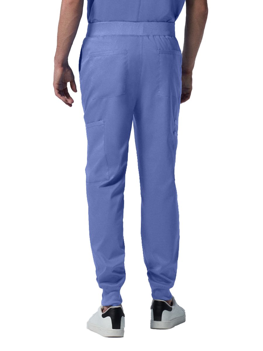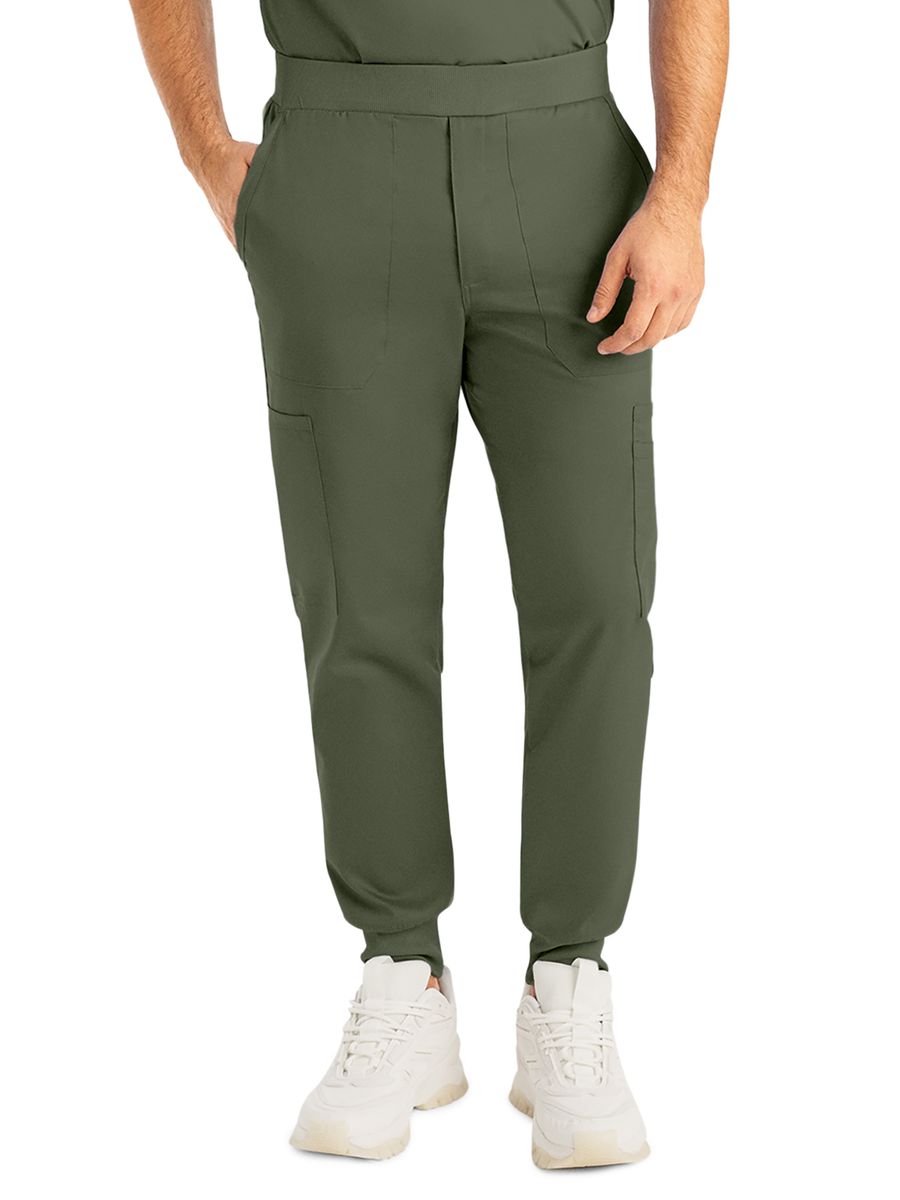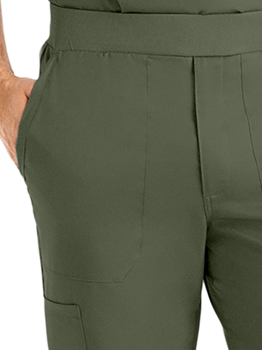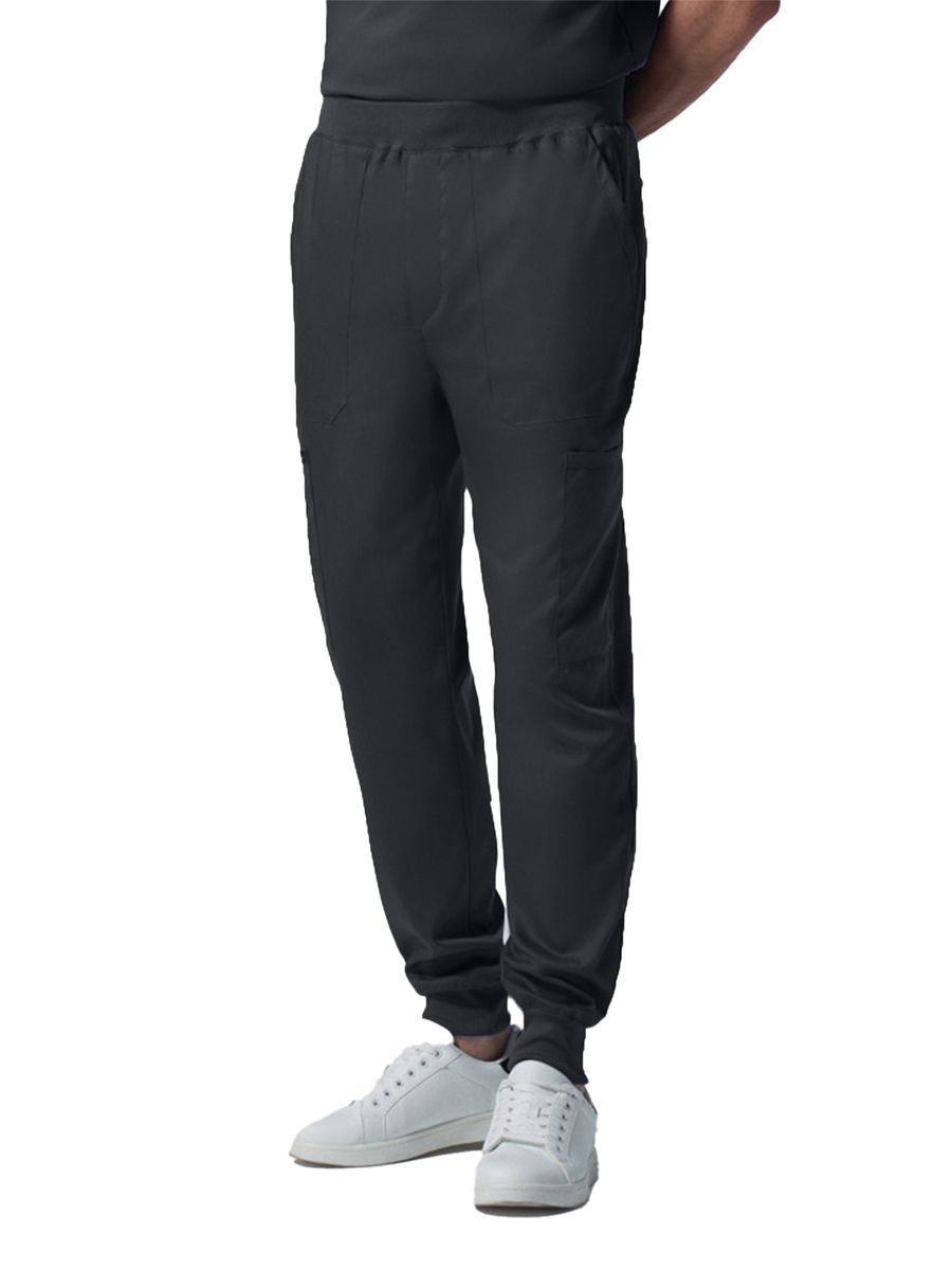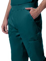 Upgrade your workwear with these men's fit jogger scrub pants, designed for comfort and practicality. The modern, tapered fit flatters your shape while allowing for unrestricted movement, and the 2-way stretch fabric ensures all-day comfort. Featuring a clean, mid-rise rib-knit elastic waist with an internal drawstring and rib-knit leg cuffs, these pants offer a secure fit and a polished look. With 7 pockets, including 3 cargo pockets and a convenient bungee loop for your ID badge, you'll have ample storage for all your essentials. These fade-resistant and wrinkle-resistant pants are built to last, making them the perfect addition to your work wardrobe.