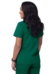 Mock wrap neck binding. Empire midriff waist. Side vents for ease of movement. Two large slant pockets. Center back length: 25.5 in size M.