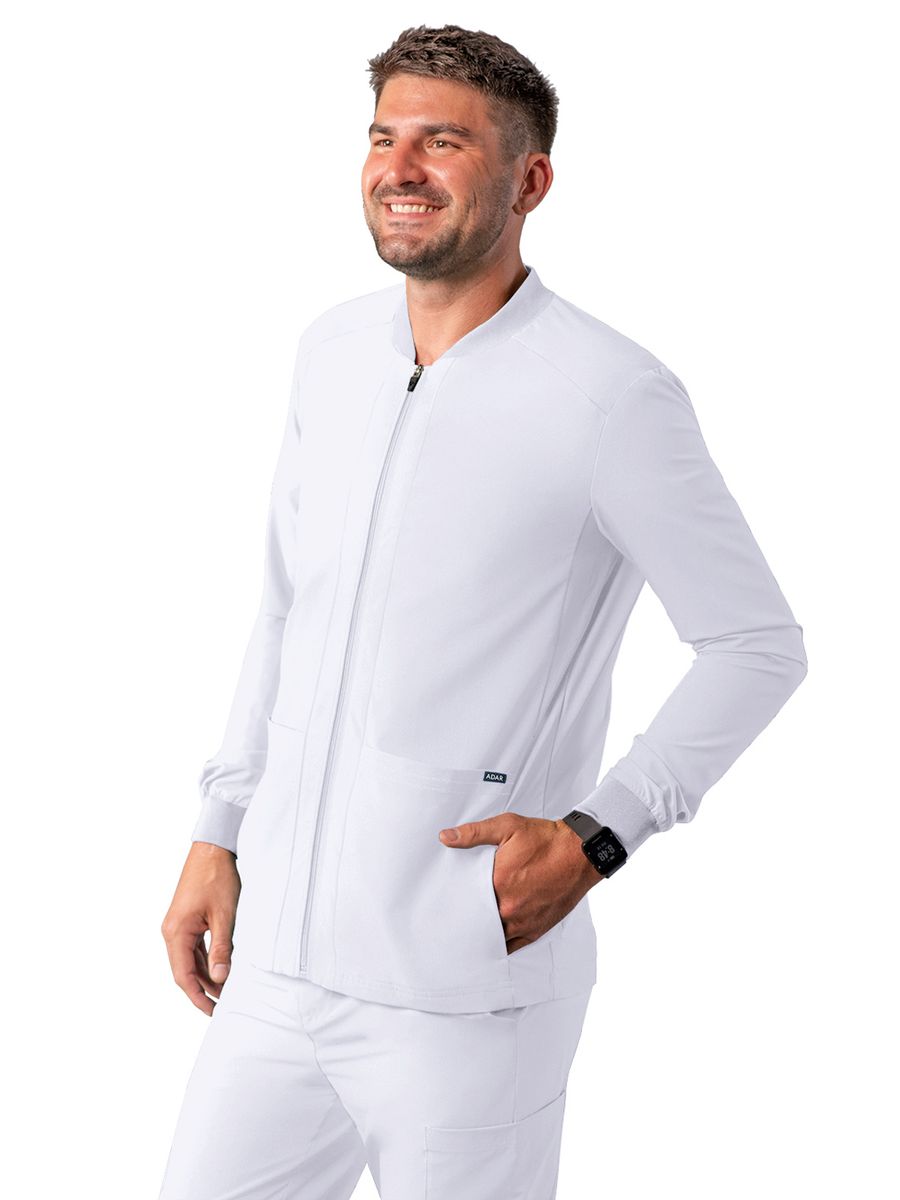 This men's bomber jacket features a self-lock branded zipper. It also features four-way stretch fabric. Four pockets: two large top entry and two side entry. Double layer rib knit at cuff. Woven label. Forward shoulder for a modern look. Double layer rib knit at the neck. Center back length: 29".