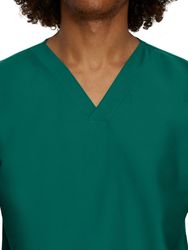 Experience timeless style and comfort with this classic fit, no-pocket scrub top. Designed for optimal comfort and ease of movement, it features a flattering crossover neck band and a woven label at the left sleeve for a professional touch. The breathable, fade-resistant fabric ensures lasting wear, while the clean front and back provide a roomier fit. This versatile scrub top is perfect for everyday use and durable enough for commercial laundry. Please note: Women may want to order one size smaller in this unisex piece.
